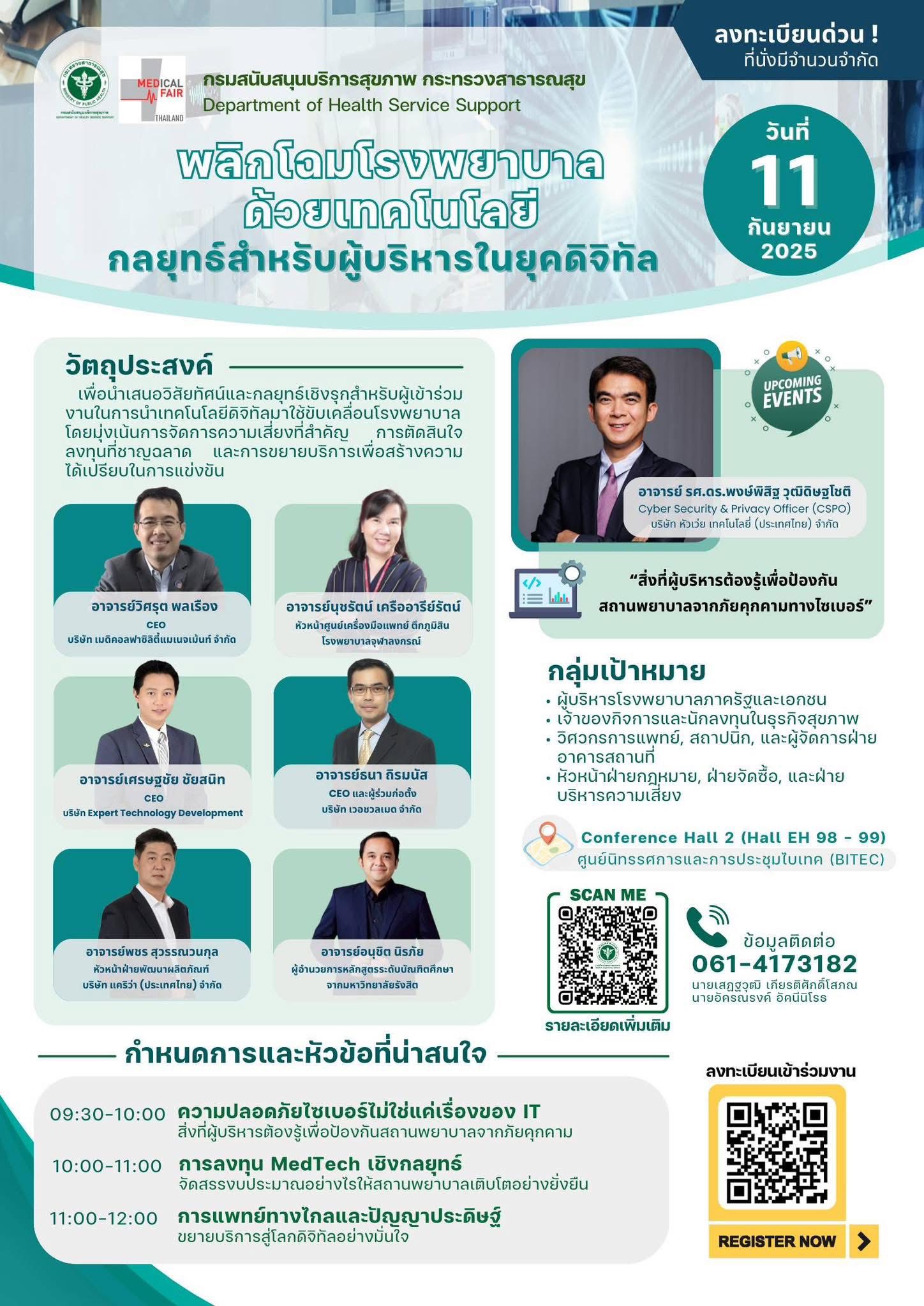 ขอขอบคุณ กองวิศวกรรมการแพทย์ กระทรวงสาธารณสุข ที่ให้เกียรติเข้าร่วมเสวนา “พลิกโฉมโรงพยาบาลด้วยเทคโนโลยี กลยุทธ์สำหรับผู้บริหารในยุคดิจิทัล” เมื่อวันที่ 11 กันยายน 2568 ณ ศูนย์นิทรรศการและการประชุมไบเทค (BITEC)