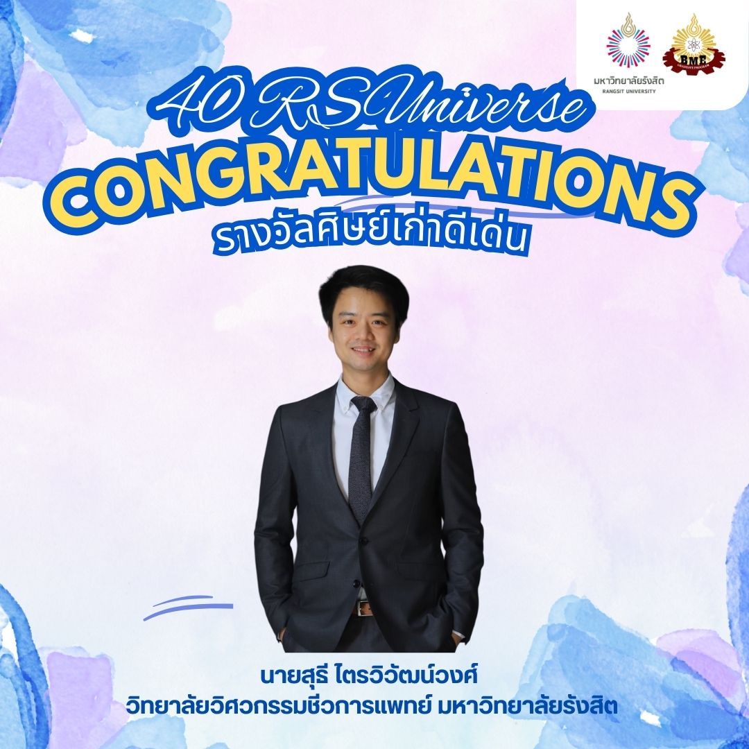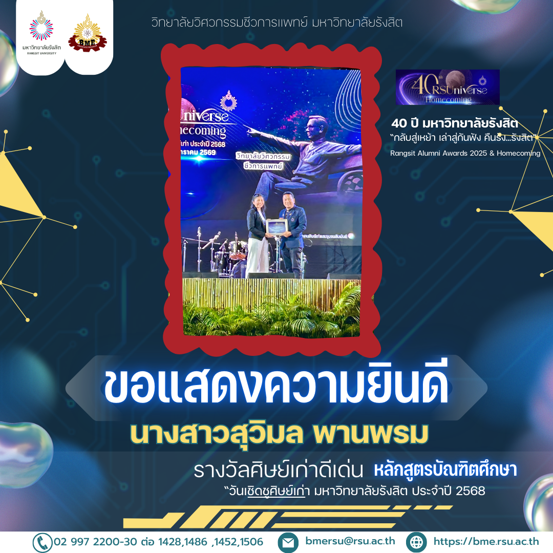 | ขอร่วมแสดงความยินดีกับศิษย์เก่า BME ทุกระดับ ทั้งปริญญาตรี ปริญญาโท และปริญญาเอก ที่ได้รับรางวัลในงาน “วันเชิดชูศิษย์เก่า มหาวิทยาลัยรังสิต ประจำปี 2568 (Rangsit Alumni Awards 2025 & Homecoming)”